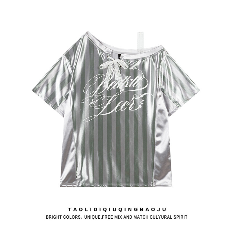 Inspired by the "Bright Colors, Unique, Free Mix and Match" philosophy found in our latest collection, this tee is more than just apparel—it’s a statement. The design features a striking contrast between sporty athletic stripes and intricate lace patchwork detailing. This unexpected pairing creates a high-fashion tension that is perfect for anyone chasing the blokette style t-shirt look. The off-shoulder silhouette adds a touch of effortless allure, while the short sleeves and loose, casual fit ensure you stay cool during the peak of summer.