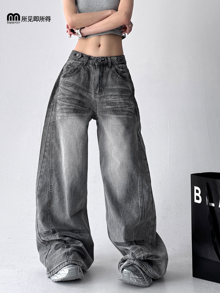 Women's 2025 American High Street Retro Grey Curved Wide-Leg Jeans