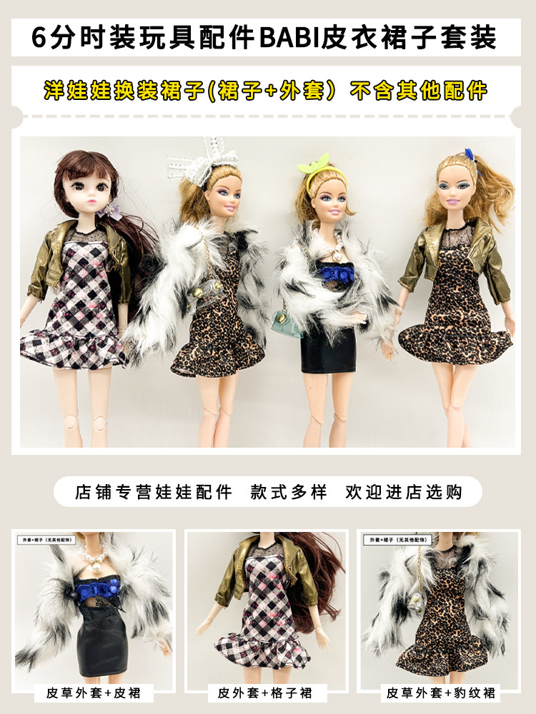 Our 1/6 scale doll outfits are designed with a focus on realistic textures and contemporary trends. This collection features sophisticated combinations that mimic real-world fashion movements. Choose from the ultra-soft faux fur coat paired with a sleek leather skirt for a "glam-rock" aesthetic, or opt for the edgy 娃娃皮衣套装 (doll leather jacket set) featuring a classic plaid skirt. For those who love a bold look, our leopard print pairings offer a fierce and fashionable statement. These BABI娃娃配件 (BABI doll accessories) utilize mixed materials to ensure your doll looks stunning from every angle.