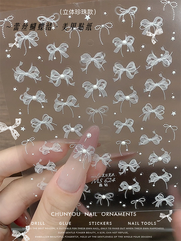 Our embossed nail stickers are designed to stand out—literally. Unlike traditional flat decals, these feature a raised, tactile texture that mimics the look of hand-sculpted gel art. The intricate lace bow nail art and delicate pearl nail decals create a high-definition relief effect that catches the light and adds an expensive, artisanal feel to your manicure. The elegant white color palette ensures a clean, sophisticated finish that complements any skin tone.