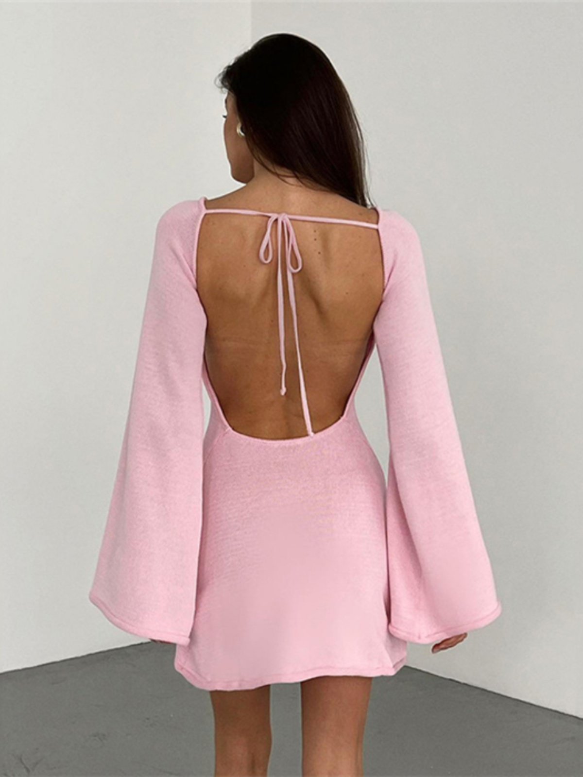 - Style: Backless, sleeveless, mini-length hemline.
