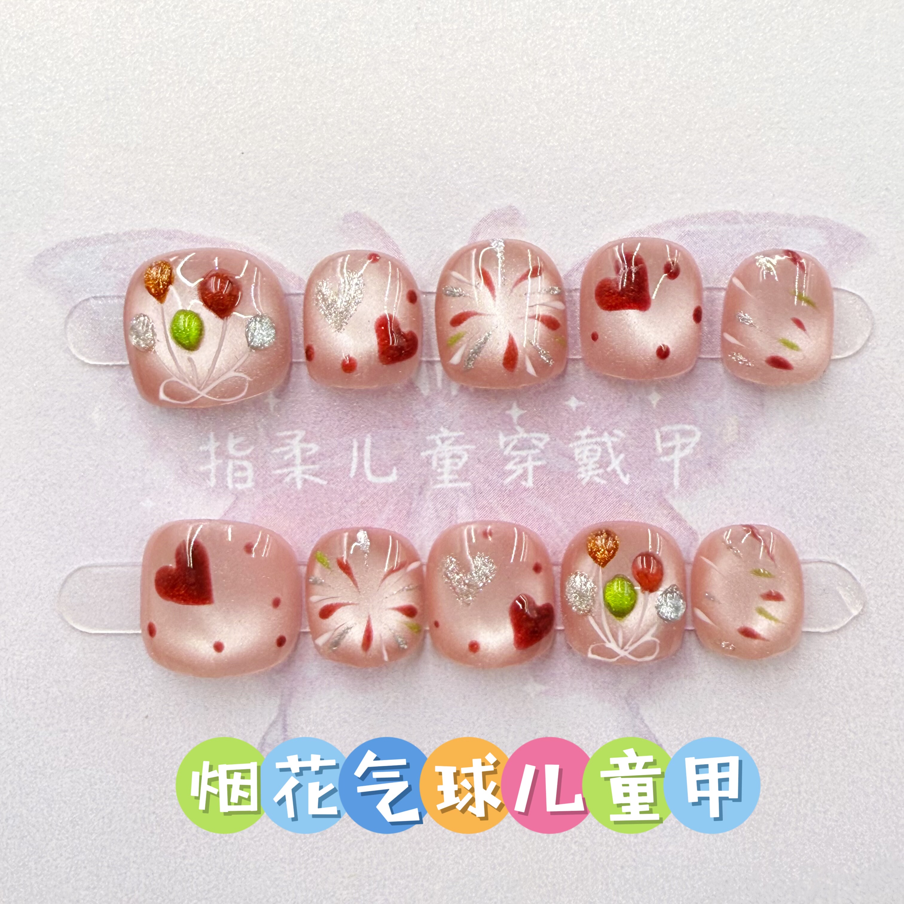 High-quality children's press-on nails featuring cute fireworks and heart patterns. Removable wearable nails for safe and creative nail art designs.