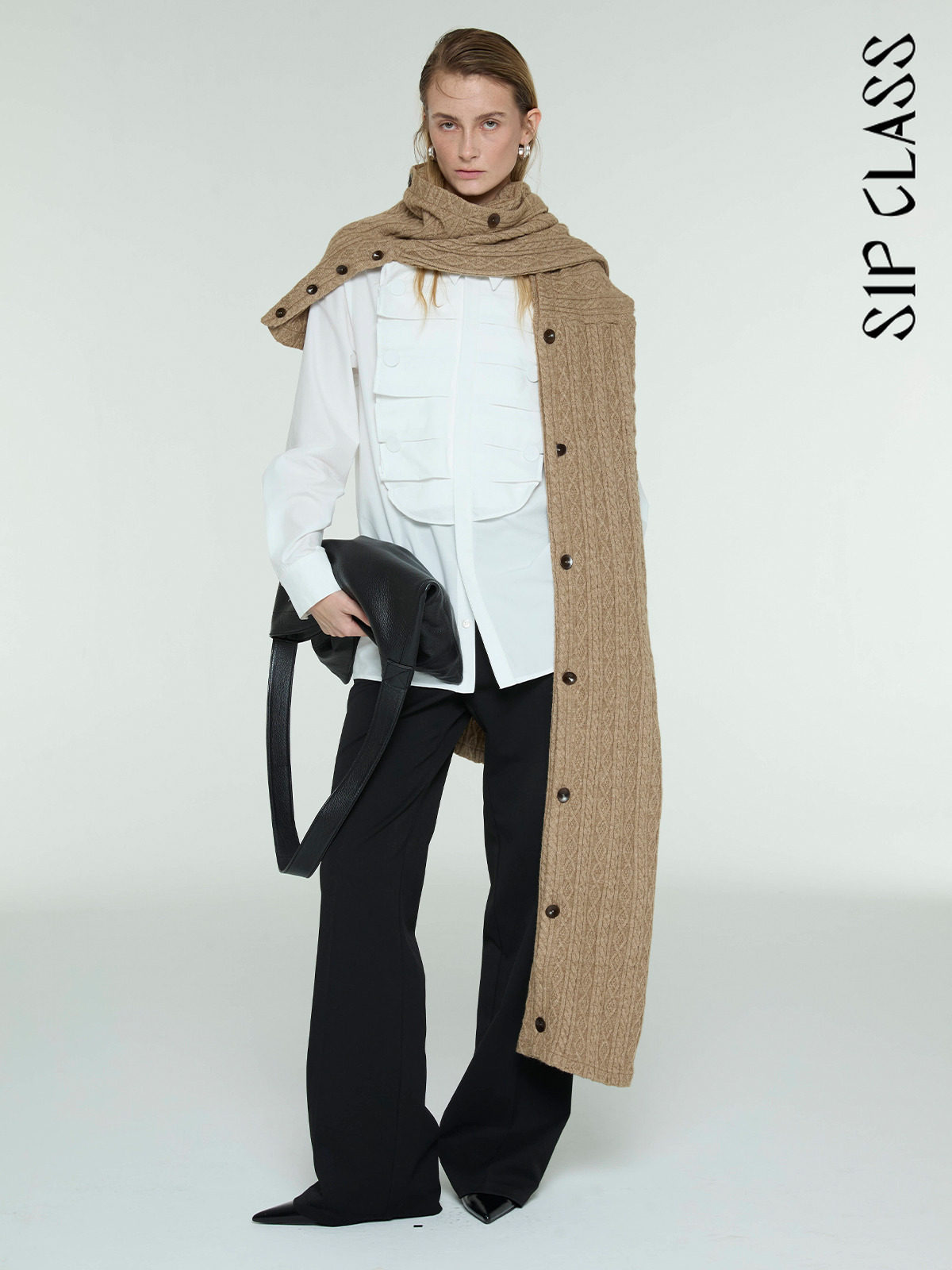 Embrace the ultimate autumn and winter layering essential with the SIP CLASS Designer Knitted Shawl Scarf. This multi-functional piece is designed with "practical ingenuity" at its core, blending the cozy warmth of a thick cable-knit scarf with the structured elegance of a long-form shawl. Its sophisticated khaki hue and unique button-down design make it a versatile staple for any cold-weather wardrobe, providing a "gentle filter" look that elevates your seasonal style.